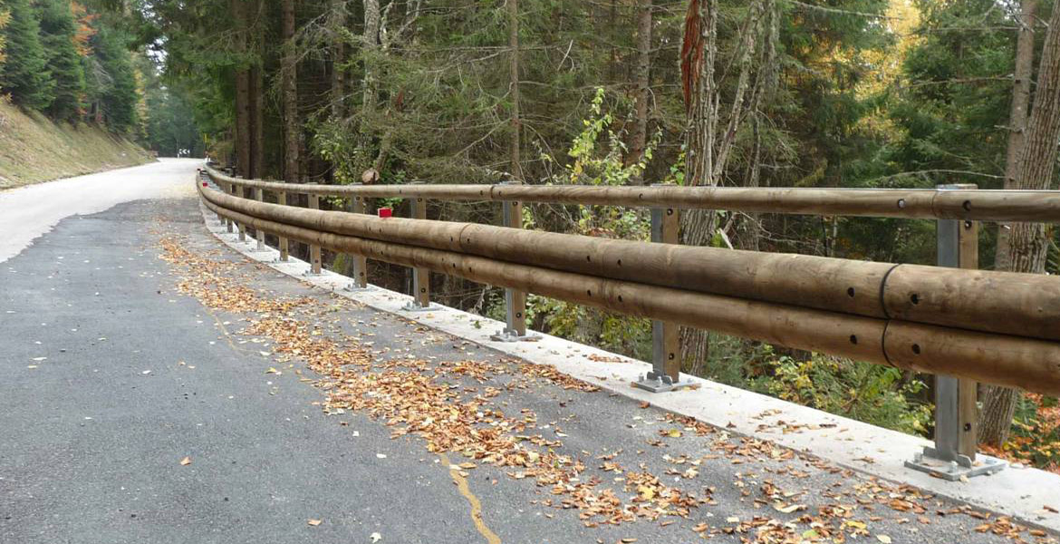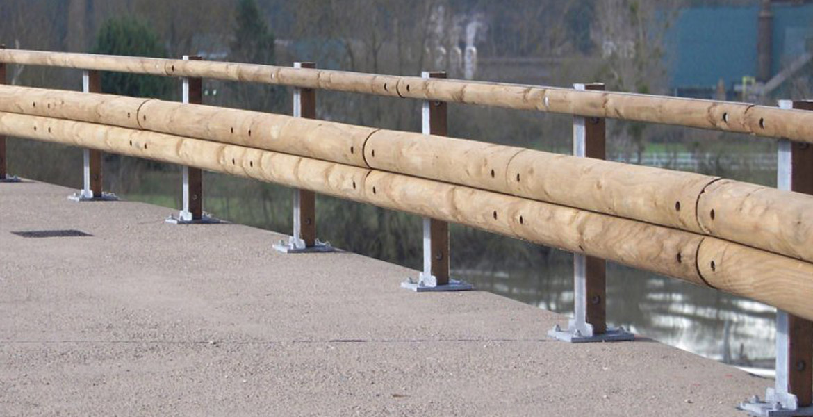 Barreras para puente con 3 niveles de barandas: constituida por tres rollizos superpuestos de diámetro 18 cm, longitud 4m o 2m, reforzados un perfil de acero en U en sus partes traseras.